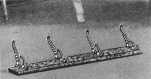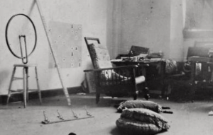 An earlier instance of a readymade illustrating Duchamp coming to see a common object in a new light (as something other than what it was made for, and other than what he presumably acquired it to be use for,) is illustrated by his 1917 readymade called “Trap;” a coat rack that Duchamp left on the floor of his studio. He apparently left it on the floor for an inordinate period of time, after which he eventually found that it took on a life of its own, and saw it as something other than an object on which to hang coats. With respect to Trap Duchamp is quoted as having said that he “would kick it every minute, every time I went out—I got crazy about it and I said the Hell with it, if it wants to stay there and bore me I’ll nail it down.” Photographs of Trap nailed to the floor of Duchamp’s studio appear below, one taken at a distance, and the other close-up.