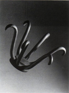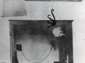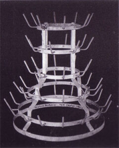 Similarly, look at the following photographs of a 1917 readymade by Duchamp. The first photograph below shows the 1917 original that he hung from the ceiling of his studio; the photograph beneath it shows a 1964 replica. What do you see it as? If you see it as a hat rack you are a rare exception—most everyone else today would be unable to classify and identify it—they would not initially see it as a hat rack or as anything in particular at all. And “not-seeing-as” is precisely the concept that Duchamp intended to and did illustrate with this readymade called Hat Rack.